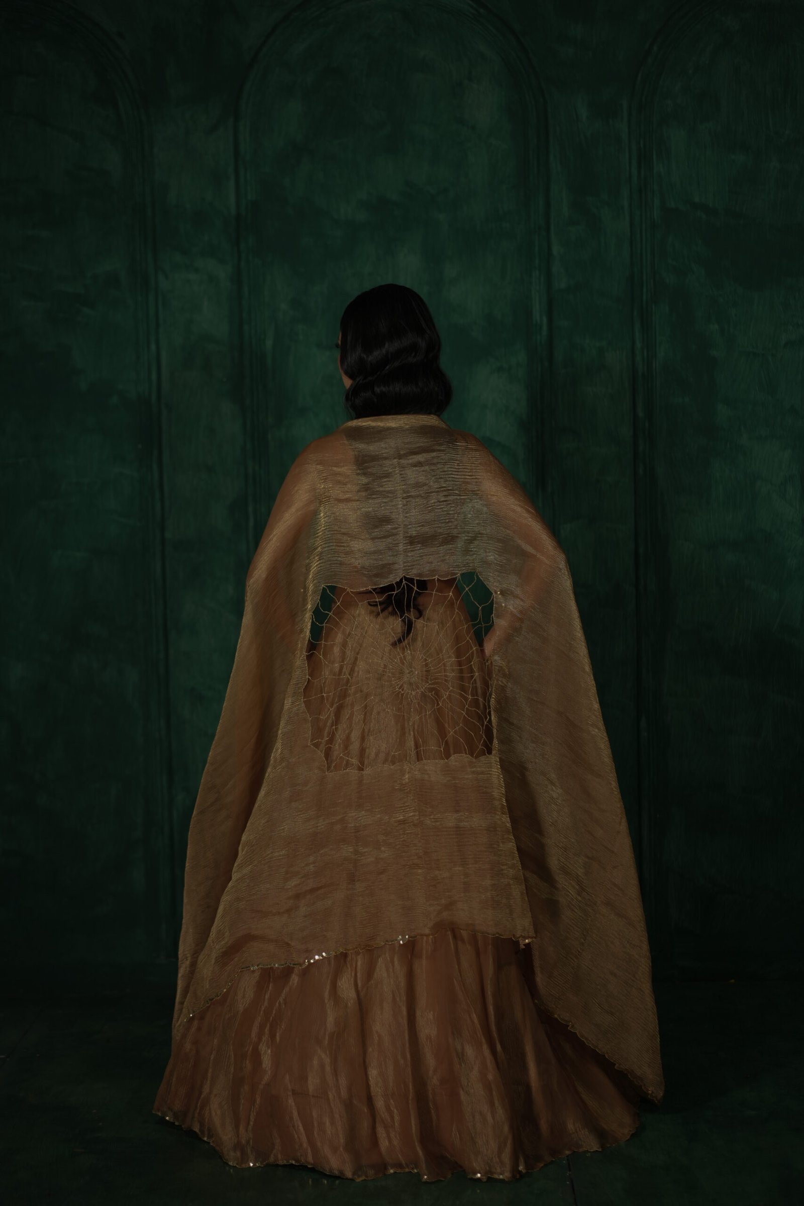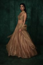 A sculptural Mocha Mousse Lehenga in pure crush tissue crafted for the new era of couture. The strapless pleated blouse, sheer dupatta & a meticulously handwoven web embody bold femininity and timeless luxury.