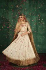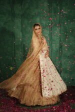 An Ivory Kalidar Kurti, embroidered with traditional intricates, sits gracefully over a mocha mousse hued lehenga crafted in pure tissue- light as air, rich in tone. The Matching dupatta, also in mocha mousse drapes like molten bronze, grounding the ethereal kurti with warmth & depth.