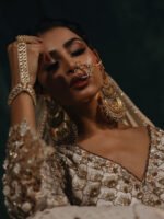 The Ivory Organza Kalidar Kurti with slits, sculpted with delicate volume, is a canvas of intricate surahi hand embroidery & jaalwork cascading along the sleeves like heritage lace. Paired with a flowing Chanderi Silk Lehenga and a mukaish work mesh dupatta that glimmers like moonlit dress.